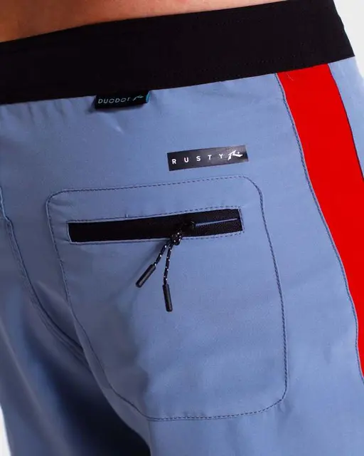 A cintura com cordão interno garante ajuste seguro, enquanto o bolso traseiro com zíper adiciona funcionalidade para armazenar pequenos objetos com segurança. O estilo fica por conta da faixa lateral e da etiqueta Rusty na perna, reforçando o visual autêntico e esportivo da marca.