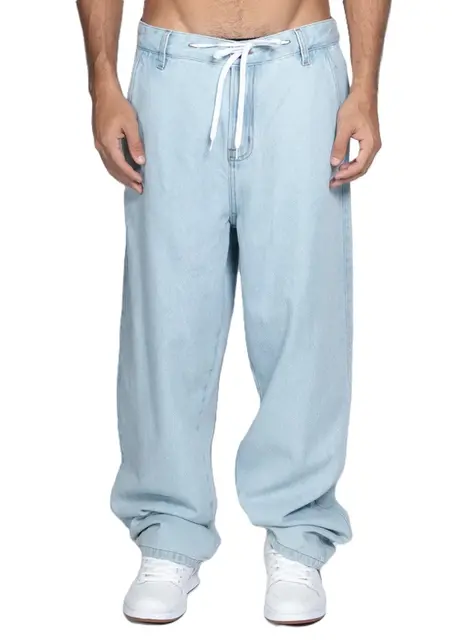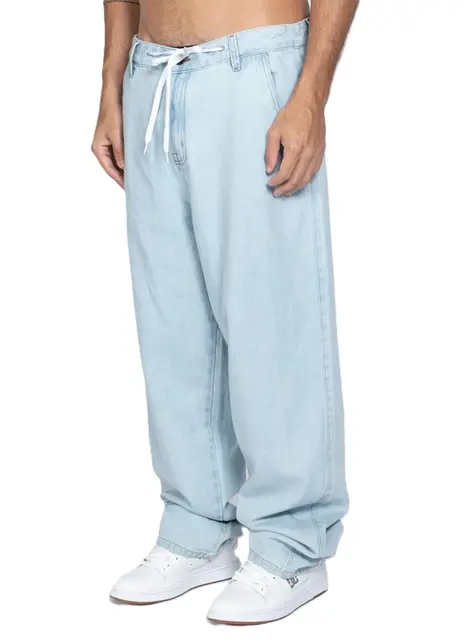 Com modelagem baggy oversized, a peça apresenta caimento amplo e estilo descontraído, ideal para compor looks streetwear modernos. O cós com cordão de ajuste permite regulagem personalizada, enquanto o fechamento por botão completa o visual clássico do jeans.