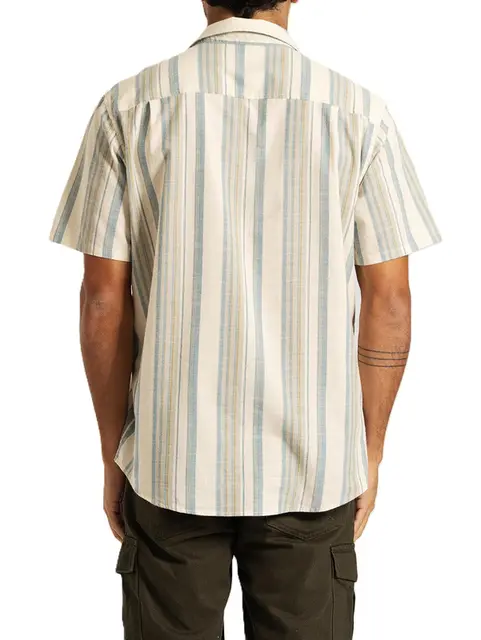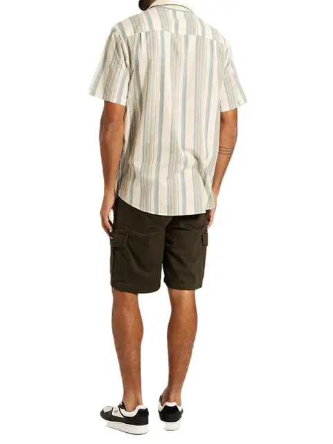 Com listras tingidas no fio e pregas traseiras que proporcionam melhor ajuste ao corpo, a peça se destaca pelos botões sustentáveis de coco reciclado, bolso frontal com encaixe para óculos e barra arredondada, que trazem estilo e praticidade em cada detalhe.