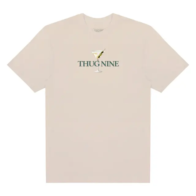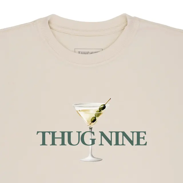 A estampa “Elegance” destaca um visual refinado e contemporâneo: na parte frontal, a taça de martíni surge em harmonia com o logo da marca, formando uma composição limpa e impactante. Já nas costas, o design ganha força com símbolos como fichas de pôquer, cinzeiro e o copo em evidência, acompanhados da frase “Within the confines of this glass...”, que reforça o clima de sofisticação e personalidade. As ilustrações estão presentes tanto na frente quanto no verso da peça, completando o visual marcante.