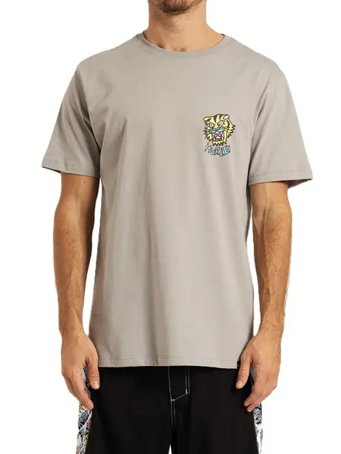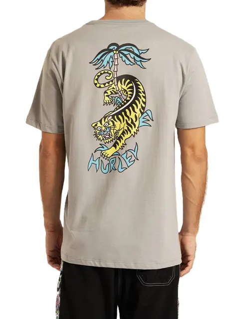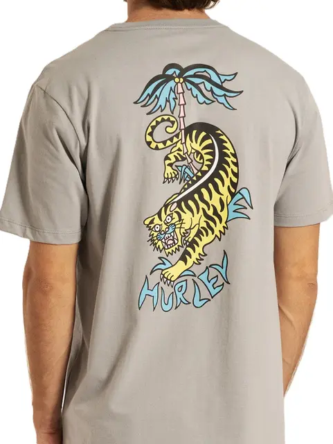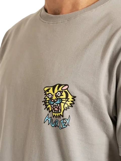 A Camiseta Manga Curta Cinza Hurley Etam Tiger apresenta estampa localizada com o emblemático tigre da colaboração, traduzindo personalidade e originalidade ao visual.