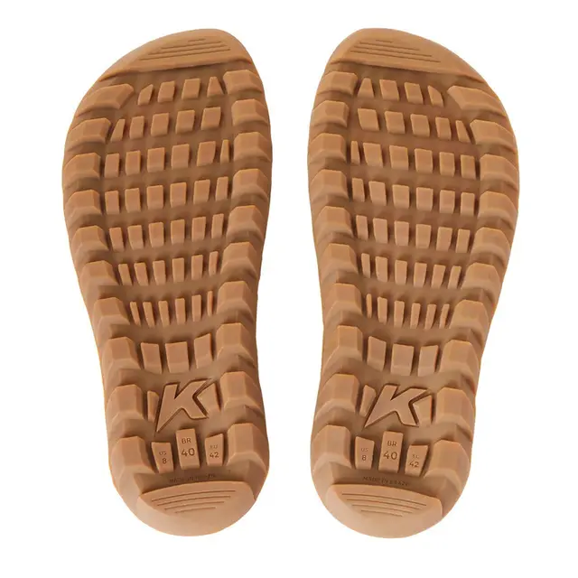 Solado tratorado na cor bege, com design robusto e antiderrapante inspirado em pneus de trator — pronto pra encarar qualquer terreno