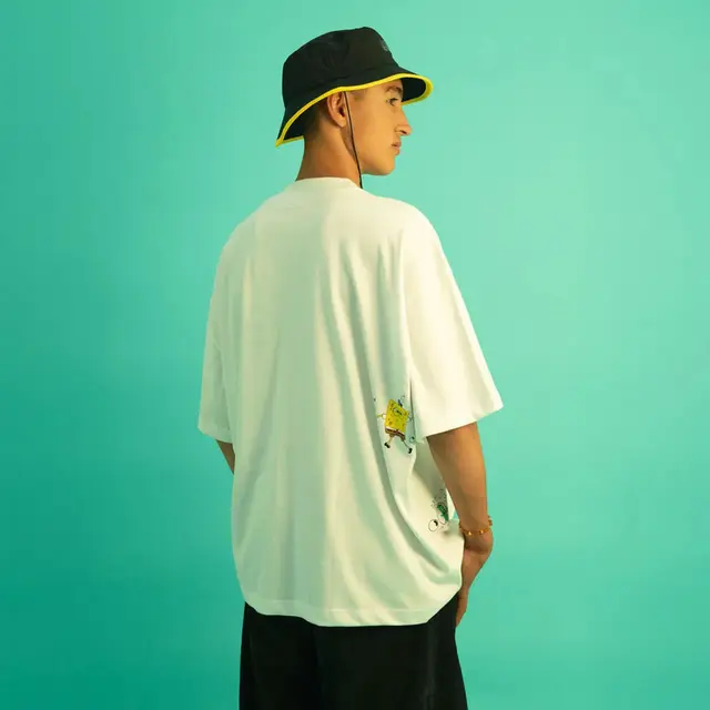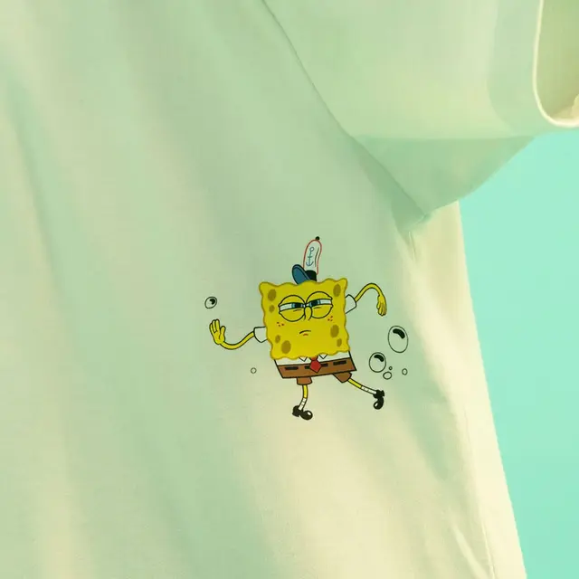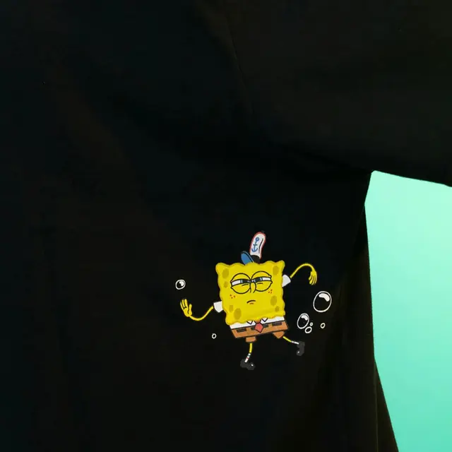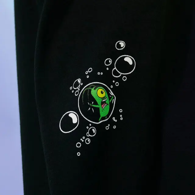 O design inclui o gráfico Saturno Bolha Lost na parte frontal e uma arte de bolhas com o Bob Esponja deslocada nas costas, adicionando movimento e originalidade. Não se esqueça do detalhe: a pequena e "amada" estampa do Plankton logo acima da barra!