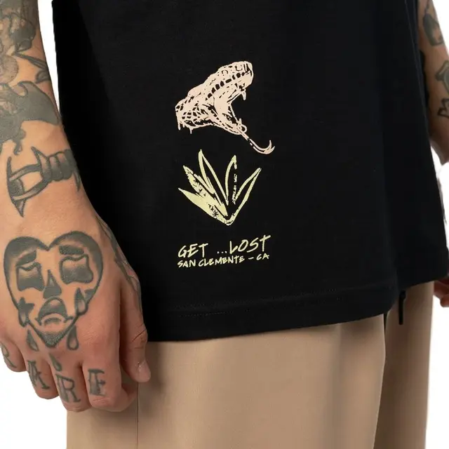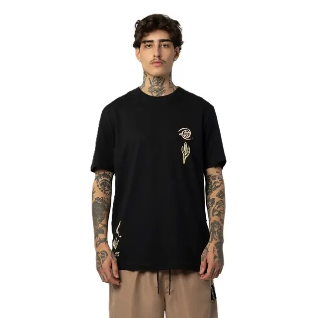 A peça faz parte da linha Get Lost e se destaca pela estampa frontal "Lost Desert" no peito e na barra, que traduz o espírito aventureiro da marca. O reforço na gola garante maior durabilidade, enquanto os acabamentos como a etiqueta bandeira lateral e o tag personalizado completam o visual com originalidade.