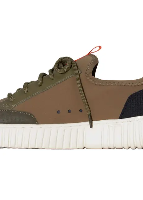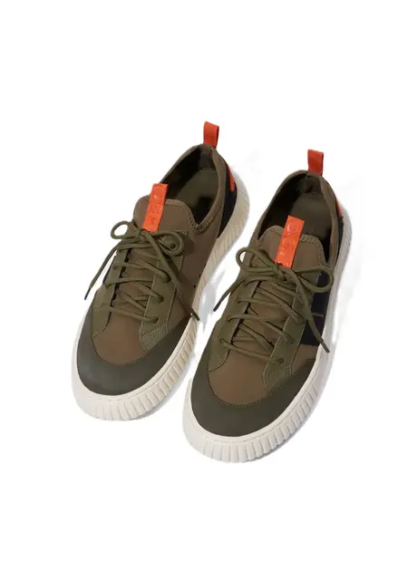 O cabedal elástico se adapta perfeitamente ao pé, enquanto os recortes de borracha texturizada no bico, nas laterais e na parte traseira agregam resistência, estilo e personalidade. O cadarço em corda esportiva reforça a identidade street do modelo, contrastando com os detalhes em couro bovino no acabamento, forro parcial e palmilha — que garantem um toque premium ao calce.