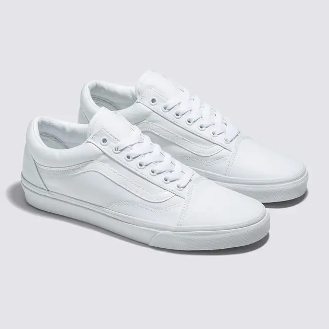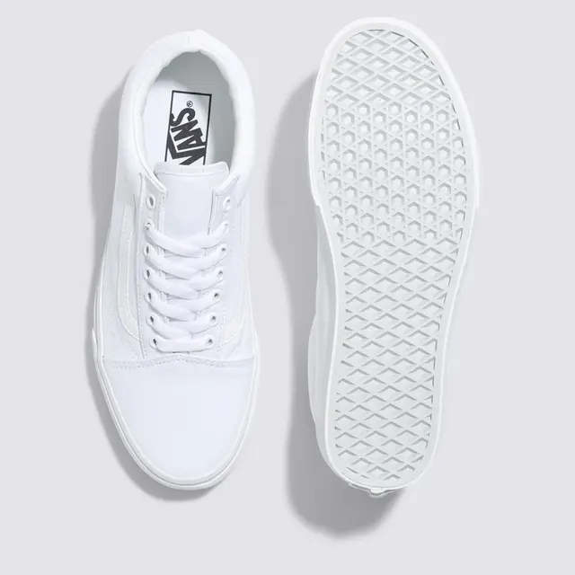 Em 1977, o tênis Old Skool, originalmente nomeado de Vans #36 foi lançado sendo o primeiro a conter a icônica sidestripe na lateral. O que começou como um rabisco de Paul Van Doren, originalmente chamado de “Jazz Stripe”, se tornou um dos ícones da marca Vans. O Tênis Old Skool True White é um tênis de cano baixo de material sintético com cadarço, sidestripe em couro branco e viras laterais de borracha na cor branca com biqueiras reforçadas para suportar o desgaste por repetição, cano acolchoado para dar suporte e flexibilidade e a clássica sola de borracha waffle vulcanizada exclusiva Vans.
